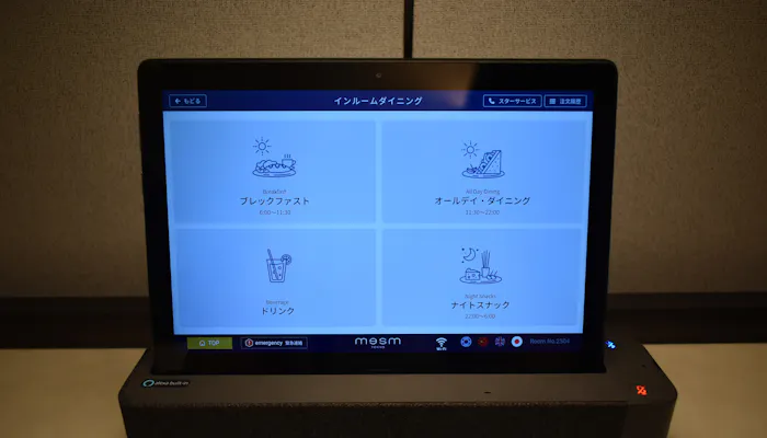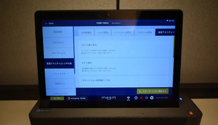 他にもタブレットでは、目覚ましのアラームや緊急時のコールをはじめ、レンタル品や追加アメニティのオーダー。