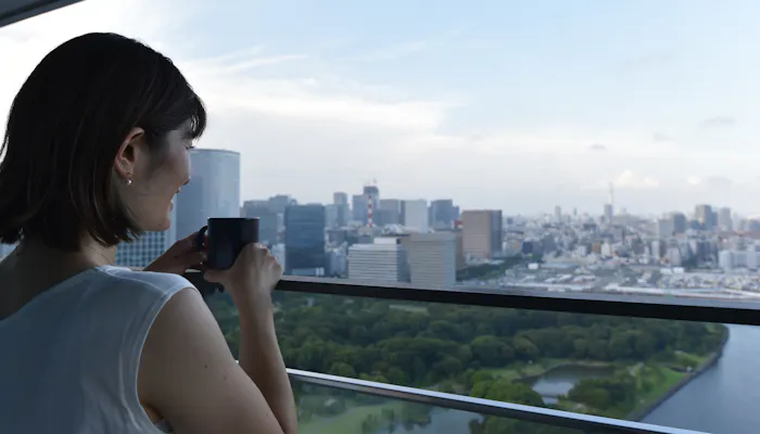 お部屋の向きによって眺望が異なりますが、「ガーデンビュー」タイプのお部屋から見えるのは、緑と水が織り成す自然と、都心部のビル群のパノラマ。