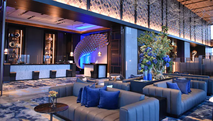 ロビーは、ブランドカラーのミッドナイトブルーがアクセントに。ラグジュアリーで洗練された雰囲気の中に、ホテルコンセプト「TOKYO WAVES」をイメージしたハイセンスなアートが数多く散りばめられ、東京の躍動感を五感で感じられます。