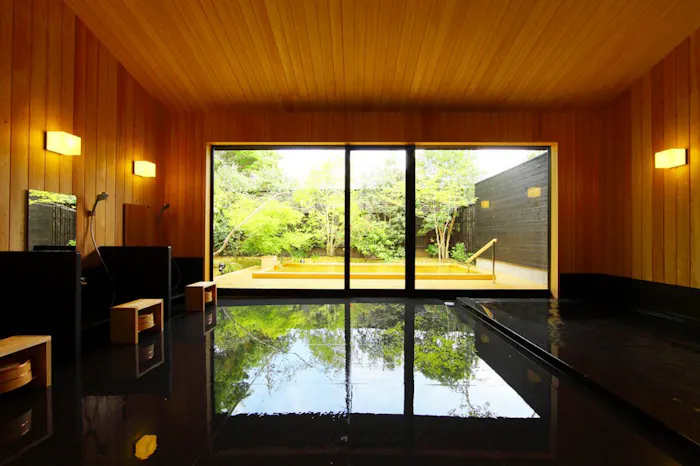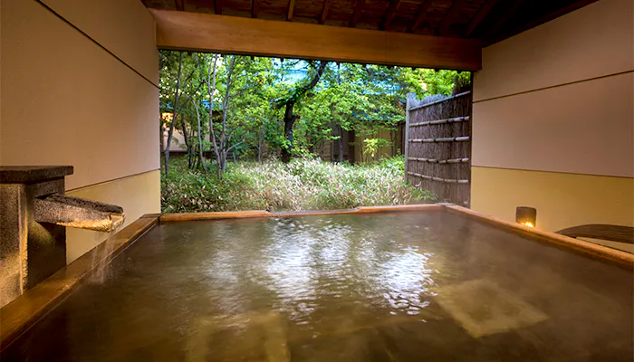 「櫻湯 山茱萸」はその公園まで歩いて5分。露天風呂付きの客室は全7室。エントランスに足を踏み入れた途端、町のざわめきが嘘のように消えていくのを実感します。