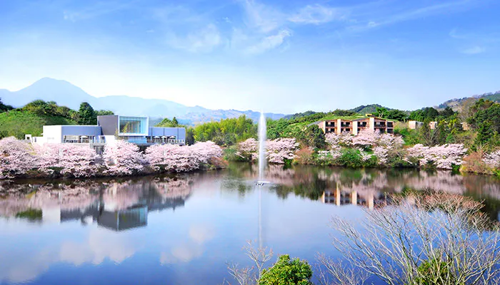愛媛県・道後温泉から一足伸ばした先、湖のほとりに静かに佇む「時地人- JIJIJIN Matsuyama」は、自然の造形を活かしたナチュラルさがゲストを優しく迎える美食の館です。全10室全てが湖に面した客室には、広々としたウッドデッキが備わっていて、指先に触れそうなほど自然が間近。豊かな自然に囲まれるようなリゾートの敷地内には、奥ゆかしく桜の樹々も点在しているので、普段の賑やかな花見の宴とは違って心静かに桜と対話できるでしょう。
