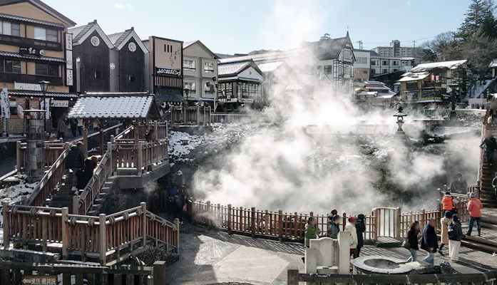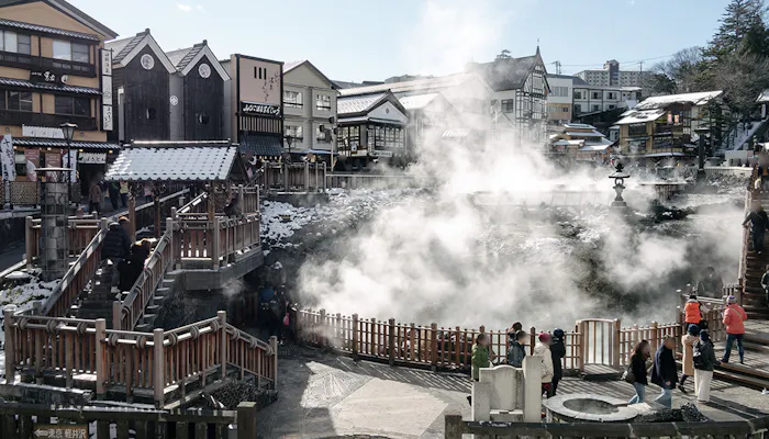 草津温泉と言えば「湯畑」。温泉街の中心に位置し、毎分4,000リットルもの温泉が常時湧き出て、湯けむりを舞い上げています。「奈良屋」があるのは、「湯畑」から徒歩で1分ほどの場所。この地で140年以上、草津温泉のシンボルを見守り続けています。