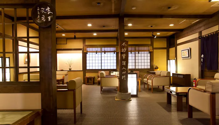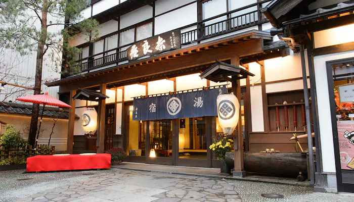 玄関には「湯宿」と書かれた暖簾、左右には屋根付きの提灯。入り口から情緒を感じさせる造りとなっています。