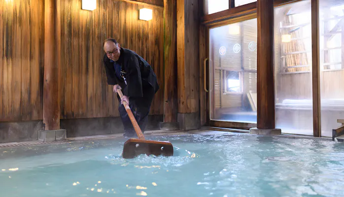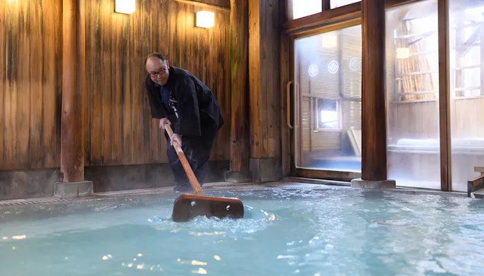 「奈良屋」が他の温泉旅館と異なる点。それは「湯守」がいること。日ごとに変わる気温や天候に左右されず、常に最高の湯浴みを味わえるのは、「湯守」が注がれる湯の温度調節をしているから。細部に至るまで、おもてなしの心が感じられます。