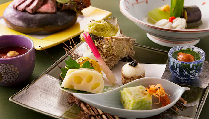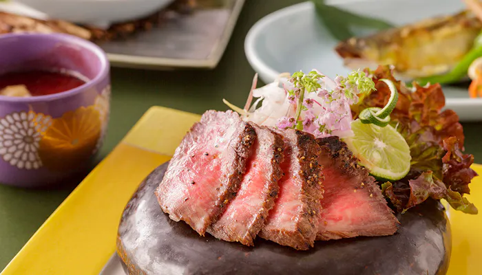 湯浴み後のお楽しみは何と言ってもお料理。地元食材をふんだんに使い、旬の素材を生かした四季折々の会席料理がゲストを口福のひとときへと誘います。タイミングが合えば、群馬県のブランド肉「上州牛」もいただけますよ。赤身のまわりにある脂肪も程よく、さっぱりした味の中に旨味がしっかり感じられる上質な牛肉を味わってください。