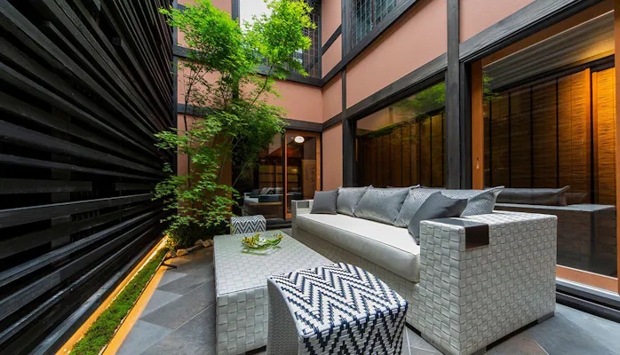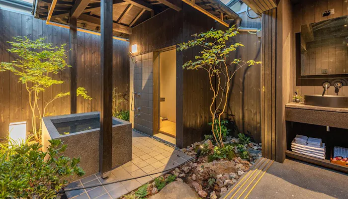 さらに部屋の奥に進むと、今度はほっこり寛げる和室が見え、京都人の美意識を象徴する坪庭が望めます。一服の日本画のような坪庭には、宿泊者だけに許された開放的な露天風呂が備わります。京の雅を感じながらの湯浴みは、旅先だからこその優雅なひとときとなるでしょう。