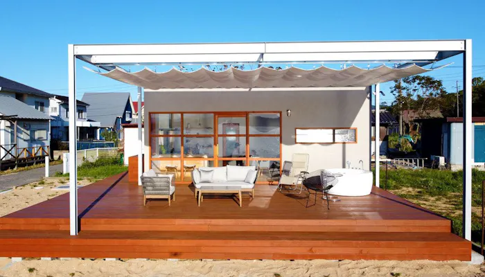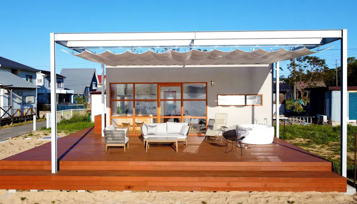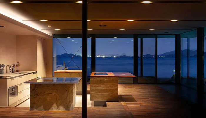 浦島太郎が竜宮城から宝を持ち帰って積んだことが地名の由来、さらには施設名に受け継がれている「積凪KITAKEN棟 -泊Rutto」。穏やかな瀬戸内海を一望できる絶景が自慢のバケーションレンタルです。デザイン性と機能性が融合した施設は、まるでミュージアムのよう。3方を大きな窓ガラスで囲んだリビングは、海や空に手が届きそうです。