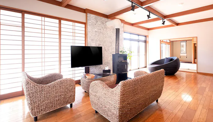 日本らしさを内包しながらも、世界各地から選りすぐられたインテリアを絶妙に配し、異国情緒も綾を成します。1階のオープンエアリビング「もみじテラス」は、施設の自慢。露天風呂が隣接しており、バスローブのままソファーに身を委ね心地よい風に吹かれる……。そんな夢時間も思いのままです。
