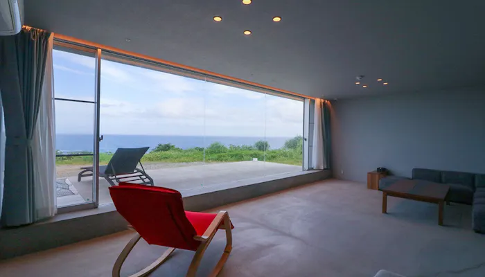 2021年、世界自然遺産に認定され、注目度が上昇している奄美大島。空港から車で約30分。太平洋を望む場所に、「クロロビアンコ奄美」は佇んでいます。ゆるりと流れる島時間を味わってほしいという理由から、あえてテレビや時計は置かないのだとか。広々としたリビングや、2階のバスルーム、寝室などから海が望める贅沢な造りです。