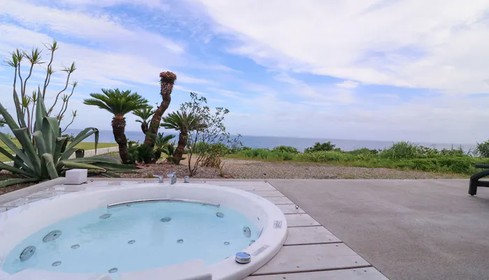 1階のテラスには、大きなジャグジーを完備。昼はプールとして遊び、夜は照明が灯るバスタブに早変わりします。奄美を代表するソテツをはじめ、南国情緒あふれる植物の先に広がる大海原を眺めながらのバスタイムは旅先ならではのご褒美。波の音と潮風によって、魂まで浄化されそうですね。