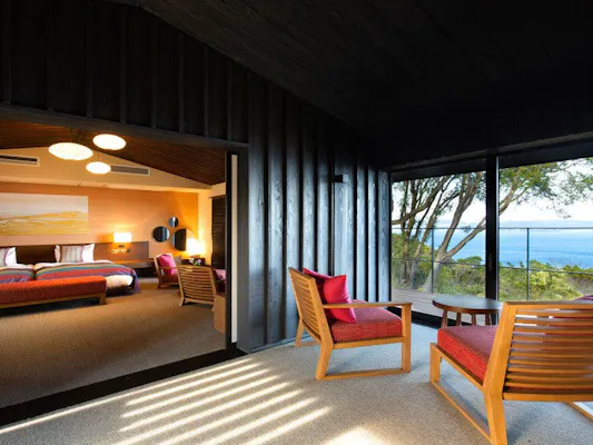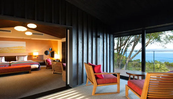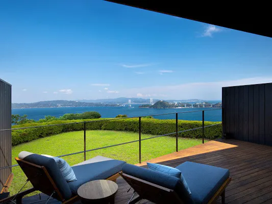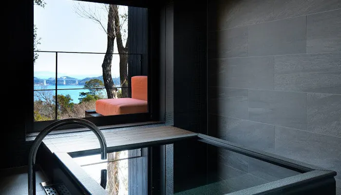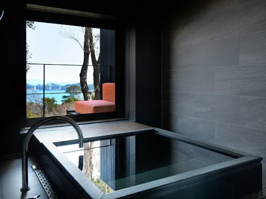 「洋奏ツイン-Yoso-(洋室/65平米)」は、石造りの通路を抜けると一気に視界が開け、鳴門海峡の眺望が目の前に広がります。客室は、ダークトーンを基調としたシックで大人っぽい空間。床などの木の温もりにほっとしながらも、洗練された佇まいは、どこか凛としており心洗われる感覚になれるでしょう。