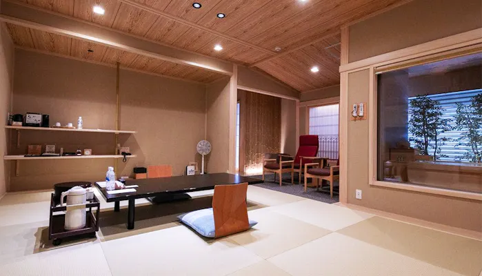 2021年7月には、離れ棟に4室の露天風呂付客室がリニューアルオープン。12.5畳相当のゆったりとしたお部屋には、「古屋旅館」が開発した全天候型の「室内露天風呂」が備わります。国産天然檜造りの浴槽に注がれるのはもちろん、宿自慢の名湯「清左衛門湯」。ボタンひとつで開閉や角度を調整できる外付のブラインドの効果で、天候や季節、プライバシーの心配無く、快適な湯浴みを楽しめます。