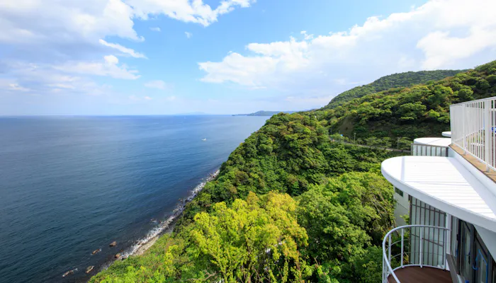 静岡県伊東の高台に佇む「ホテルふたり木もれ陽」は、都心から最短1時間のアクセスで非日常を味わえる、オールインクルーシブスタイルのリゾートホテル。全10室が、相模湾と伊豆大島、初島までも見渡すオーシャンビューで、源泉掛け流しの展望温泉風呂付き。空と海に浮かぶような湯浴みや、室内の「インガーデン」でいただく朝食は、“天空の絶景宿”ならではの醍醐味です。