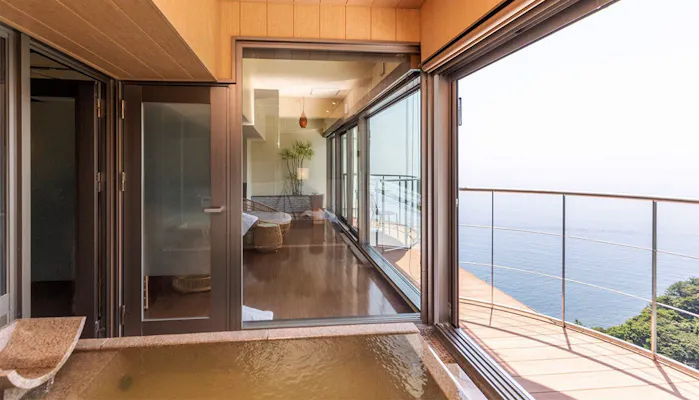 開業5周年を迎えた2021年には、より快適に過ごしていただけるように館内のリニューアルを実施しました。「ジオ・スイート」タイプの中で人気の高い「ジオ・スイート 3階【禁煙】」は、浴室をリニューアル。従来は浴槽に寄りかかると山や国道が視界に入ってしまいましたが、リニューアルに伴い、自然に海を眺められる造りになりました。日常を忘れて、ここならではの温泉と景色に癒されてみては。