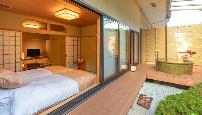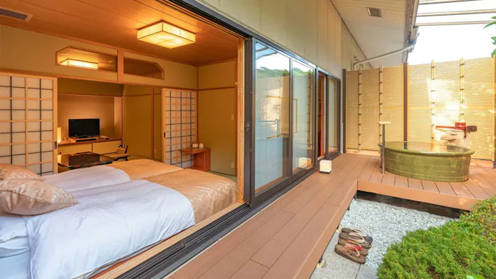 2021年6月リニューアルをした3室の中でも特筆すべきは、「【2階庭園付き和室】源泉掛流し露天+半露天風呂」。客室専用庭園を拡充し陶器型露天風呂を設置したことで、従来からあった檜の半露天風呂とあわせて2つの露天風呂を楽しめるようになりました。