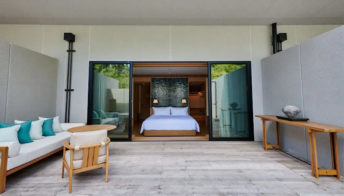 そのうちの一つ、82平米の「デラックス キング(プライベートテラス/プールアクセス付)」は驚きの広さを誇るプライベートテラス付。なんと直接サーマルプールへアクセスできるので、まるで南国のリゾートを訪れたよう。自分へのご褒美に、こんなお部屋でのんびりするのもお勧めです。