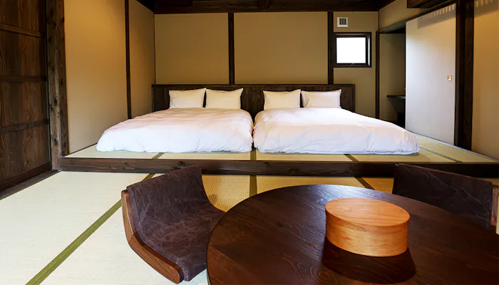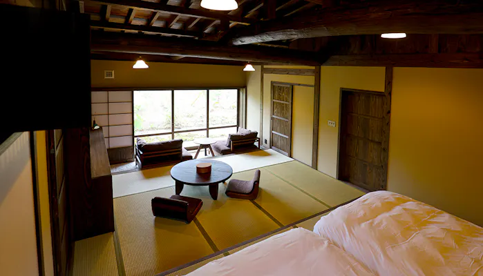 どの離れ客室も同じ広さで約50平米。畳敷きの居間と寝室、トイレと浴室が備わります。それだけのシンプルな間取りですが、2人で過ごすにはちょうどいいサイズ感。簡素な設えだからこそ、屋根勾配を活かした天井高が気持ちの良い開放感を生んでいます。