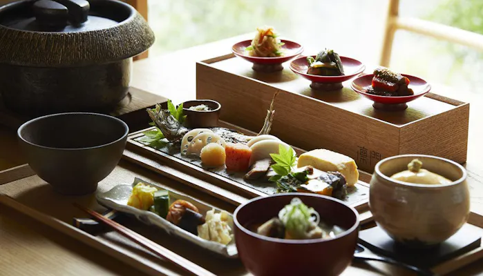 なかでも箱膳におさめられた朝食は、目を見張るほどの充実ぶり。目覚めのマンダリンオレンジジュースに始まって、完全無農薬米の釜炊きごはん、平飼いの卵や野菜料理があれこれと並び、寝坊して食べられなかったら後悔しそう。