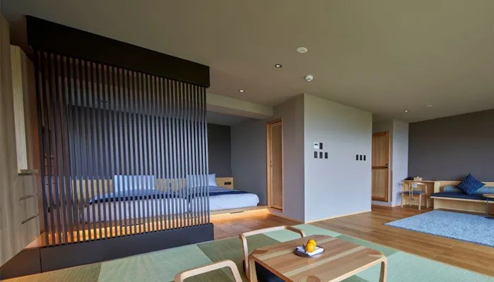 お部屋は全8室。「湯治ルーム」と呼ぶシンプルなスタンダードツイン、回遊式のスーペリアツインやコーナークアッド、孤を描く高い天井と専用テラスを持つ最上階のビュースイートなど、タイプの違うお部屋が揃います。