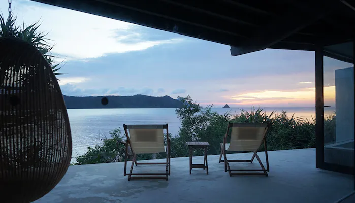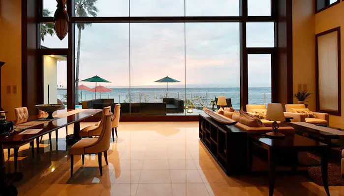 全面ガラス張りの開放的な設えは、紺碧の海を望める設計になっています。南国の陽射しに煌めく海を愛でる……、そんな大人だけに許されたゆるりとした島時間を満喫して。