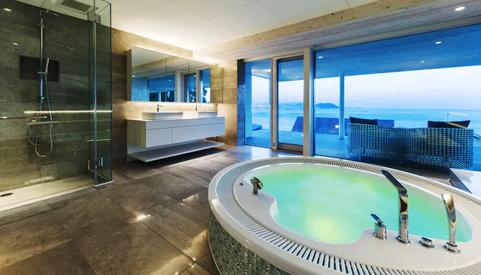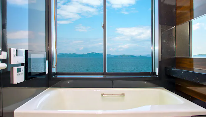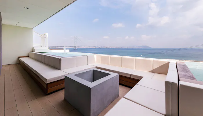 施設自慢のルーフトップテラスにも、広めのジャグジーを完備。ジャグジーに浸かりながら、遮るもののない空を仰ぎ見るのも贅沢な時間(ご利用の際は水着の着用が必要です)。夜には、ライトアップされた明石海峡大橋がロマンチックな夜景を魅せてくれることでしょう。アニバーサリーなどの特別な日に、素敵な絶景をゆったりと眺めたい……そんな希望が叶うバケーションレンタルです。