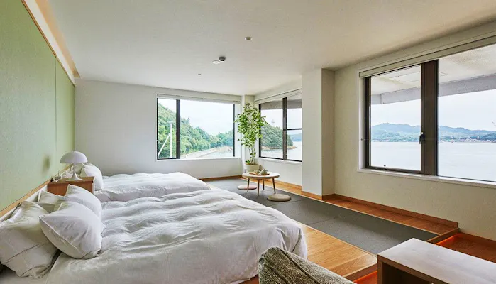 人口10人にも満たない馬島は、車での入島に許可が必要な特別な小島。その離島に佇む「GLAMPROOK しまなみ」は、専用車や専用プレジャーボートでの送迎を行っており、非日常感や冒険気分が味わえると評判です。シックなインテリアの「ジュニアスイートD<ホテル棟>」は、海とひと続きのような景色が魅力。