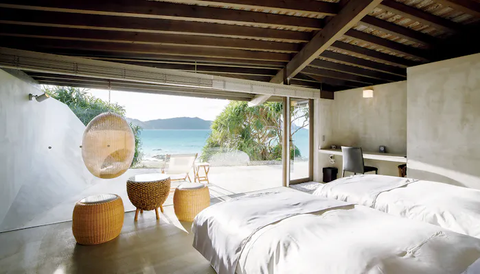 世界遺産に登録される奄美大島で、特に海が美しいとされる島北部・笠利町に佇む「ヴィラリゾートホテル 伝泊 The Beachfront MIJORA」。奄美出身で国際的評価も高い建築家・山下保博氏が“島の自然と対話する”をコンセプトに建てた静謐の宿です。全13室は使い勝手の良い洋室のほか、心和む畳敷きの和タイプの客室も。