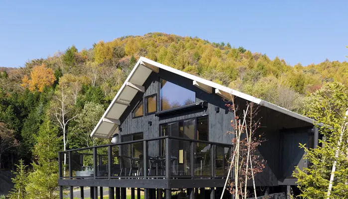 三角の大屋根を載せた独立型のヴィラが16棟。その名の通り、北軽井沢の大きな空に包まれて建つ「あさま空山望(くうざんぼう)」は、2020年11月に開業したプライベートヴィラ。全棟ペット可でドッグランも完備。スパやレストランへ出かける際は各ヴィラ専用の電動カートがあって移動もスムーズです。