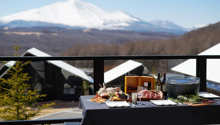 北軽井沢の大きな空に包まれて建つ「あさま空山望(くうざんぼう)」は、2020年11月に開業したプライベートヴィラ。全16棟のヴィラは、どれも三角の大屋根を載せた独立型。ファイヤーピットがあるウッドデッキで望む浅間山の雄姿は、グラス片手に眺める夕暮れ時も、爽やかな光に包まれる早朝も格別に美しく、見飽きることがありません。遊歩道を10分ほど歩いた先には宿いちばんの絶景スポットもあり、360度の美しい景色に出会えます。