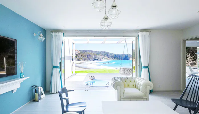 伊豆急下田駅から車で約10分。環境省の調査で「極めて水質の良好な水浴場」にも選ばれた、入田浜のビーチに建つ「Aquaholic Iritahama」は、2つの棟が連なるレンタルヴィラ。どちらも3LDKで広さは150平米超。設計は多くの高級ヴィラなどを手がける「Mアーキテクツ」が担当しています。マリンカラーで統一されたお部屋から見る海の、なんときれいなこと!まるで国内とは思えないリゾートテイストあふれるロケーションにワクワクすることでしょう。