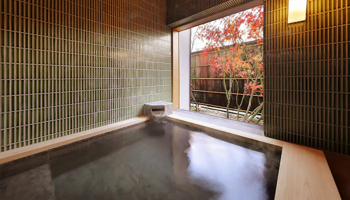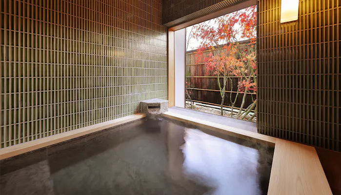 客室は、伝統と機能美が融合した「東亭」と、数寄屋造りの離れ「離塵境」があり、2021年11月には「東亭」に「紅葉」「青竹」の2つの和スイートが誕生しました。漆喰と木を基調とした室内は、京都で約400年続く日本唯一の唐紙屋「唐長」の「枝紅葉」と「細竹」の唐紙がアクセントに。リビングダイニング、和室、ベッドルームが独立した居室空間、タイル張りの温泉半露天風呂など、全てがゆったりと心地良く「シンプルな美しさ」を感じられるお部屋です。