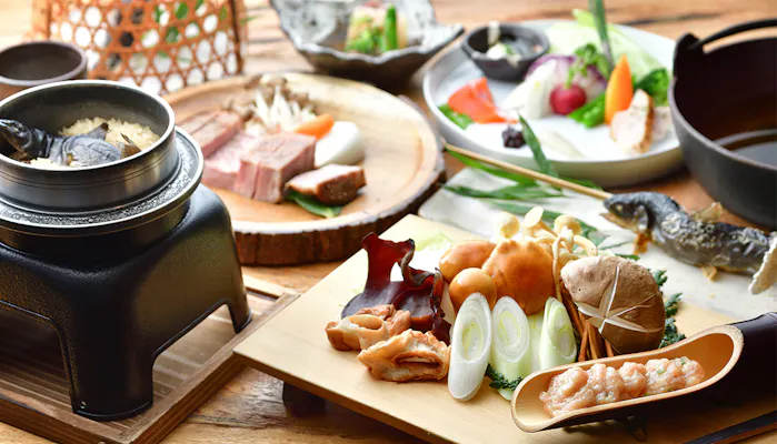 群馬県・水上温泉郷にある「水上温泉 蛍雪の宿 尚文」は、地元食材をふんだんに取り入れた山人料理が自慢の田舎宿。四季の木々に包まれた敷地内には、別荘を思わせる離れ形式の客室と、古民家の趣を大切にした母屋の客室があり、全てに温泉の客室露天風呂が備わります。