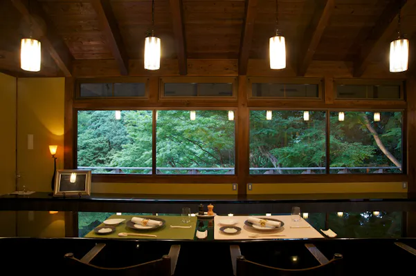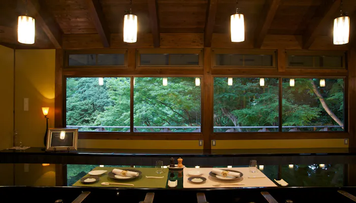 「旅館 紅鮎」には、僕専用のカウンター席があるんです。他の席から見えない所で、窓側を向いている席。一人客は少しぽつんと見えるので、景色を見ているだけで様になります。