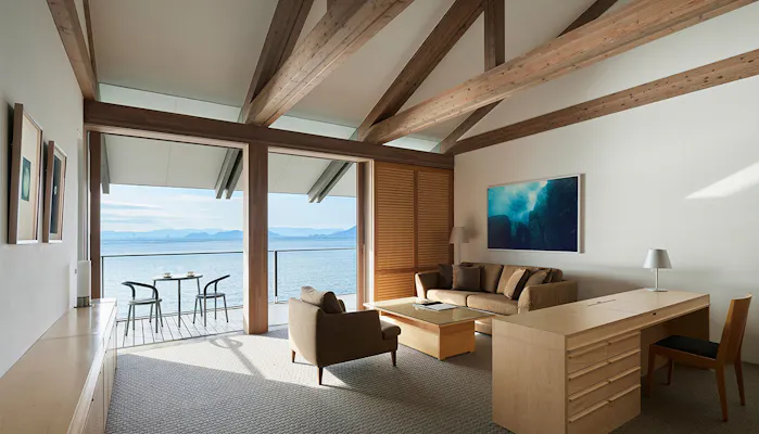 客室は36室全てがフロントオーシャンビュー。「NEST WA」「NEST DX」「NEST JS」「NEST SU」の客室には、海が見えるバスタブとテラスが備わります。眼前に広がる島前カルデラや行き交う船の姿を眺め、何もしない時間を過ごしてみては。
