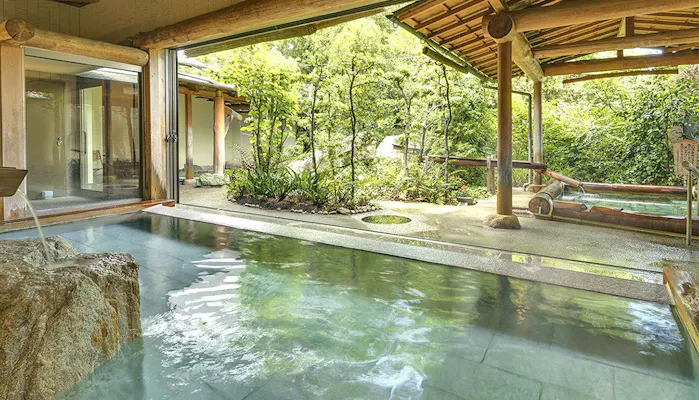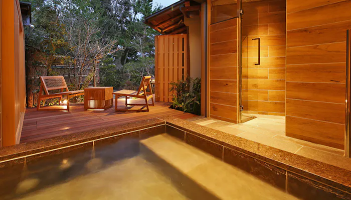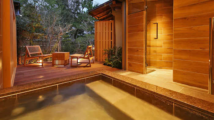 2022年3月には、宿の一番奥で最も静かな環境に、新客室「半露天風呂付 特別室 天の浮橋」が誕生。和室の他、ソファを配置したリビングとベッドルーム、書斎など、広さは約95平米。半露天タイプのお風呂や、客室一面に繋がるテラスも魅力のひとつです。現代的な寛ぎと開放感のある空間で、日本庭園を眺めながらゆっくりと過ごしましょう。