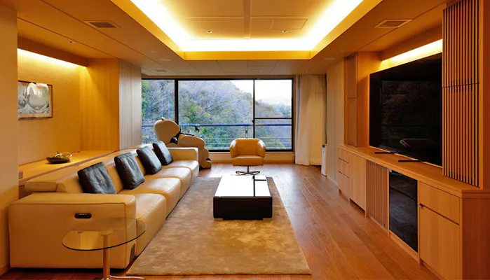 東館に先駆けて、2022年4月には、西館7階に新基準客室「銀泉露天貴賓室『吉兆』(禁煙)」が誕生。高機能換気設備や非接触扉の導入に加え、約200平米の室内は、部屋食可能な和室、ベッドを配した寝室、シアタールームを兼ねたリビングに、ワーキングスペースも備わる贅沢さ。お風呂は窓を開閉できる半露天風呂タイプで、浴室内と脱衣洗面室に床暖房を施しています。