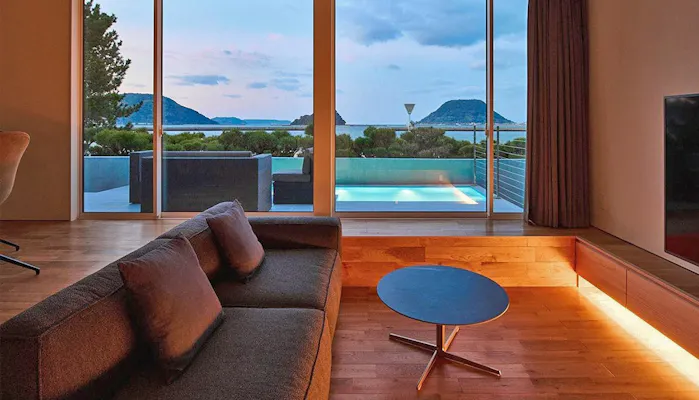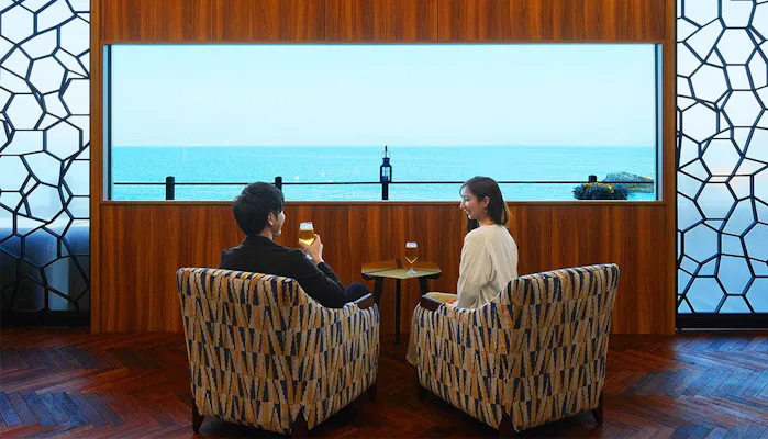 三方を海に囲まれ、仙酔島をはじめとする鞆の浦の美しい景色を館内の随所から見ることができる「ホテル鴎風亭」。2022年3月には、2つのスイートルームと、アルコール類やソフトドリンク、スイーツなどを楽しめる「プレミアムラウンジ」が誕生しました。