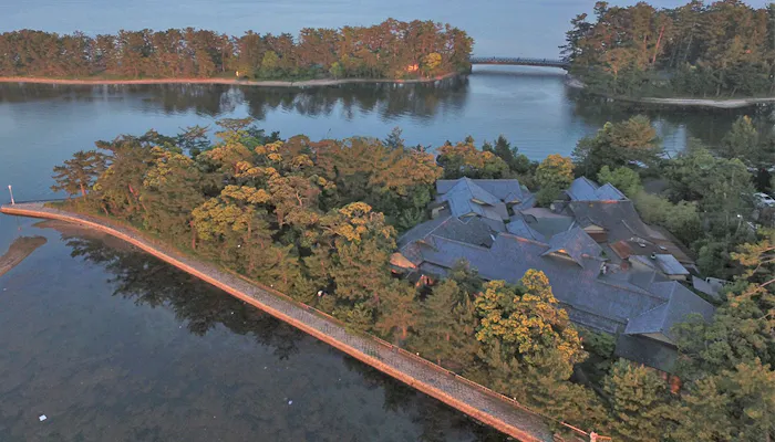 日本三景・天橋立から徒歩で約5分、智恩寺文殊堂の奥の小さな岬にひっそりと佇む「文珠荘松露亭」。今では数少ない木造総平屋数奇屋造りの建築が、天橋立の景観と見事に調和しています。