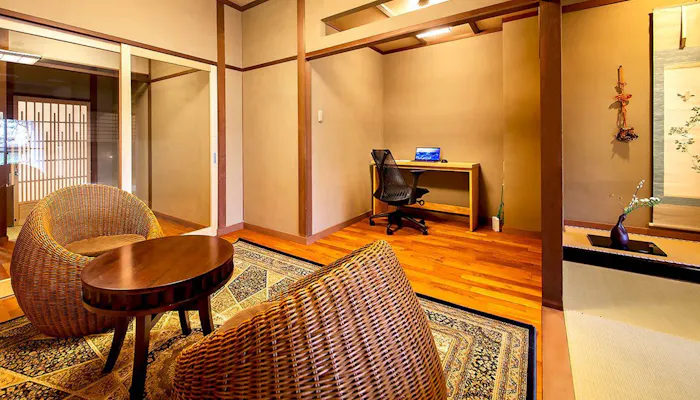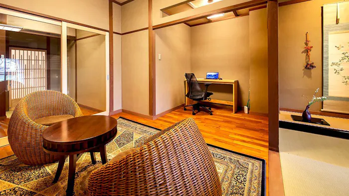 2022年3月には、本館にある3つの客室が、純和風旅館の設えはそのままに、過ごしやすさを追求した和室に生まれ変わりました。3タイプとも寝室にはベッドを備え、本間と寝室に次の間も有するゆとりある間取りの「恵方」は、夕朝ともに部屋食が可能。「晒女」と「紀文」は、お部屋の一角にワーキングスペースを備えています。