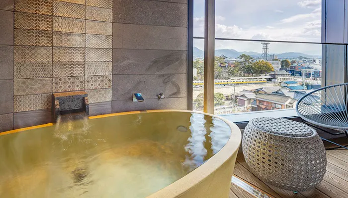 6.テラスの露天風呂から讃岐富士やことでんを眺めるスイートルーム