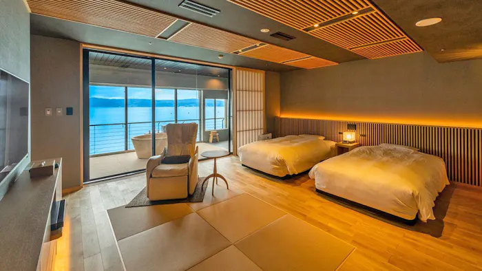 佐賀県唐津市にある「水野旅館」は、唐津城を眺めながら、玄界灘の海の幸をいただける料理旅館。2022年3月には“景色のなかに、泊まる。”をコンセプトとする一棟貸切のヴィラ「Castle Side Villa 波静」がオープンしました。フローリングの床に、ベッドやソファを配した、現代的でスタイリッシュな設えです。夕食はお部屋で、宿自慢の会席料理を。オーシャンフロントの開放感・非日常感のある空間で、心身ともにリフレッシュしましょう。