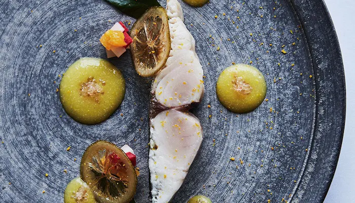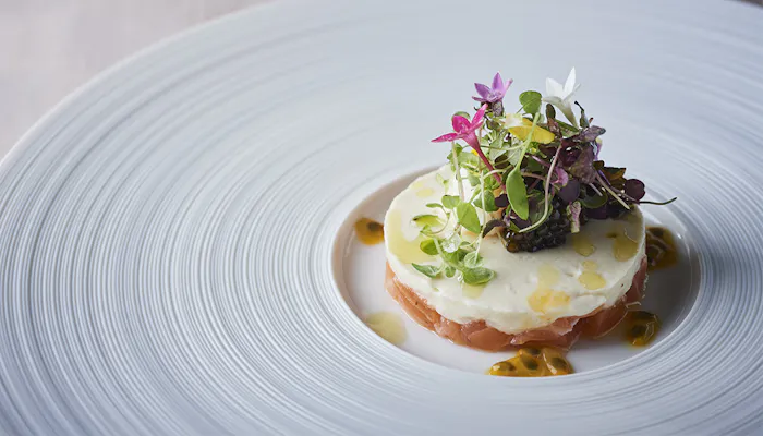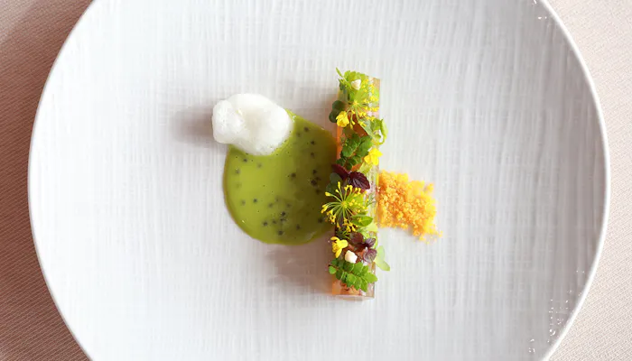 お食事は敷地内で一番見晴らしの良い高台に位置するレストラン棟へ。いくつもの工程を重ねて仕上げる、「ひらまつ」ならではのこだわりの一皿を堪能して。