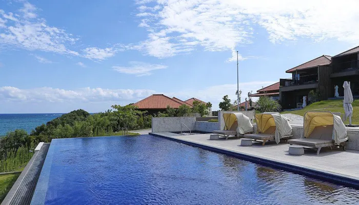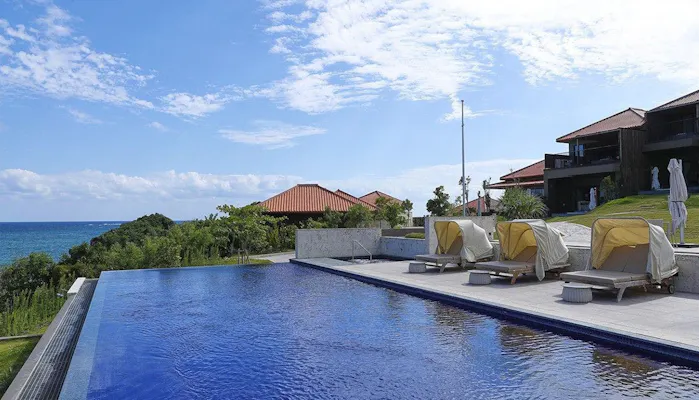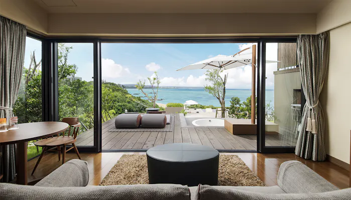 なかでも最上級客室「THE AONAGI スイート」からの景色は圧巻です。窓の外に広がる海と空、スカイブルーのプールにはっと息をのむでしょう。