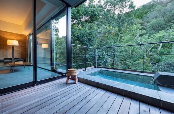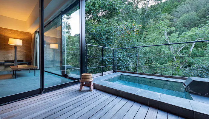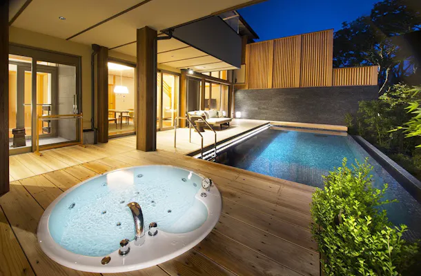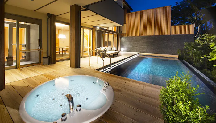 日本建築の凛とした美しさを感じる本館や、ペットと泊まれるお部屋など多彩な客室のなかで、「露天風呂&プライベートサウナ・プール付 メゾネットヴィラ」の優美さはことさら。専用のプールとジャグジー、露天風呂が備わり、豪華な邸宅を思わせる造りは、大切な人と特別な時間を過ごすのにうってつけでしょう。