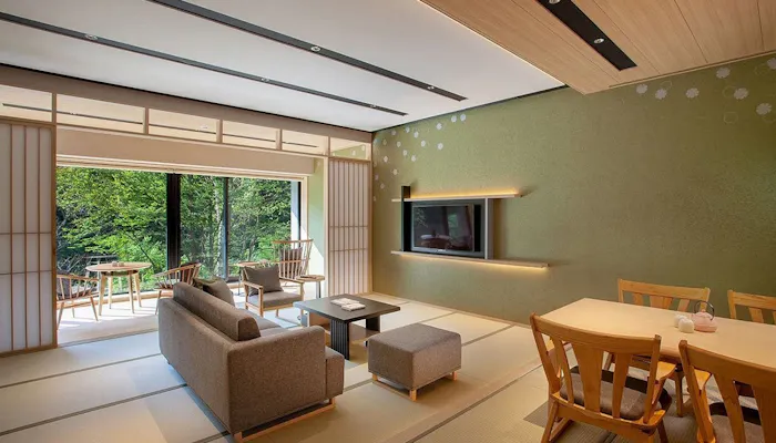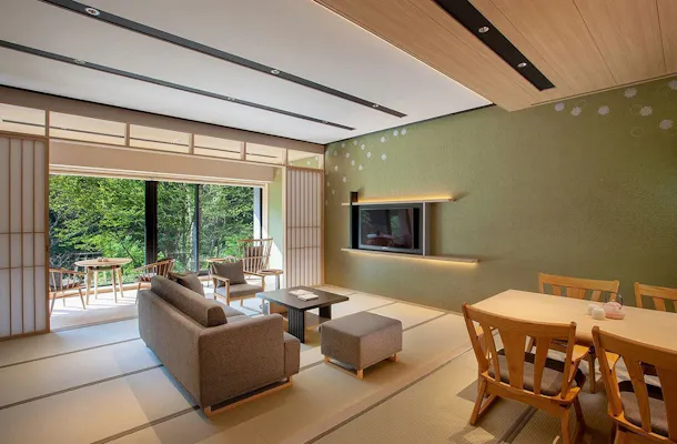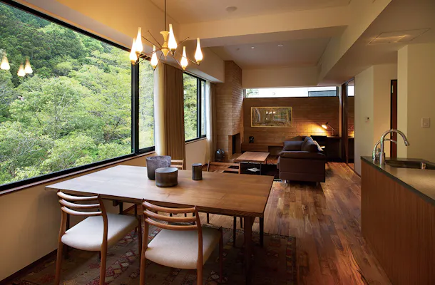 全16室の中で、「ザ・スイート/禁煙」は、特別な日に似合うお部屋。ミニキッチン付のダイニングや、渓流を望むテラスに温泉露天風呂が備わります。緑に抱かれるような環境で、日ごろのストレスを手放し、ありのままのご自身に還るバスタイムを楽しんで。