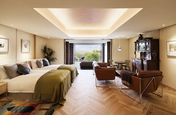 全26室に、展望風呂が備わるラグジュアリーな造りの中でも、「プレミアムスイート 2ベッドルーム(ツイン/キング)」は施設で最上級の客室。開放感を味わえる角部屋を活かしたビューバスからは、自然が手招きしているかのような癒しの風景を眺めながら湯浴みを満喫して。