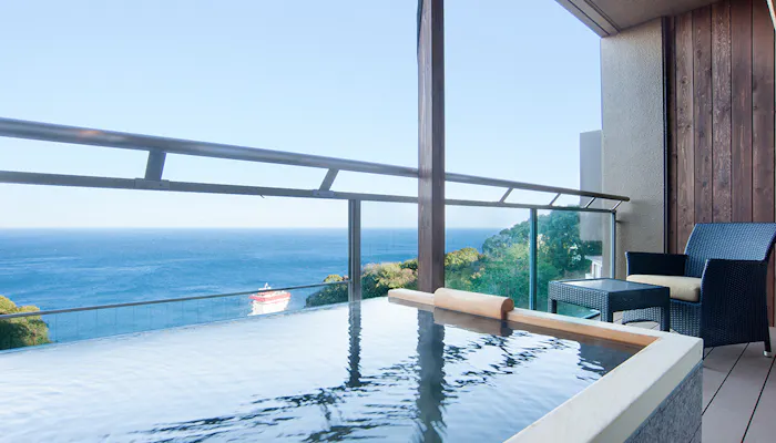 電車で東京から約1時間、名古屋から約2時間と好アクセスの熱海。その高台に立つ「ATAMI せかいえ」は、大海原を見晴らす絶景の宿です。全室に、長寿の湯として親しまれてきた伊豆山温泉を掛け流しで楽しめる露天風呂を完備。潮風を感じながら、非日常感溢れる湯浴みを体験できるでしょう。