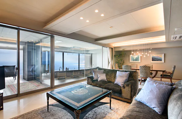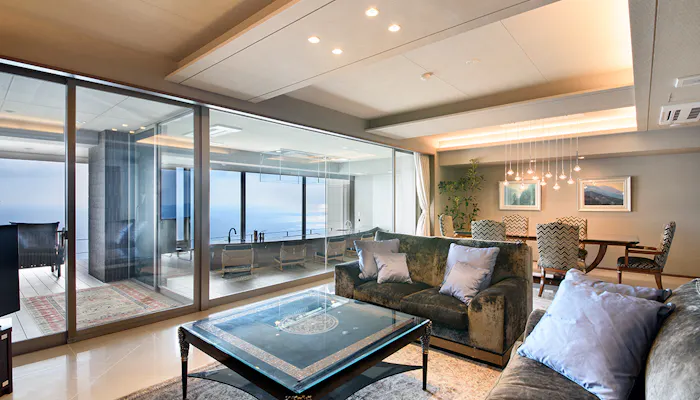 「オーシャンビューペントハウス TSUKI NO MICHI」(147平米)は、1日1組限定の特別室。プライベートキッチンを備え、専属のシェフが目の前で鉄板料理を提供するライブ感は格別です。専用バトラーのきめ細やかなサービスも嬉しいポイント。