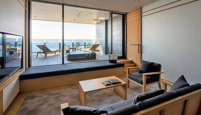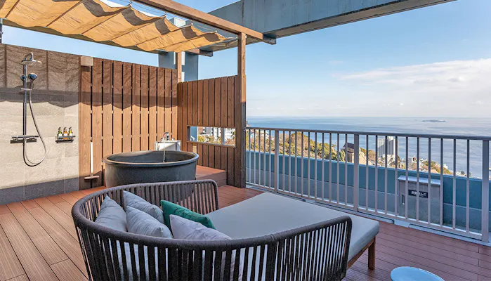 客室は全32室で、最上階には4つの異なるコンセプトのスイートルームが。広さ約136平米というゆとりある空間で、専用の温泉露天風呂とプライベートテラスを完備しています。テラスからは、パノラミックな熱海の海景を一望。花火大会開催時にはテラスから花火が見え、お部屋に居ながら夢のようなひとときを過ごせます。