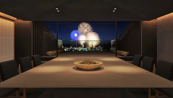 2.最上階の「茶寮」で正面から花火を楽しむ全室温泉付の隠れ家宿